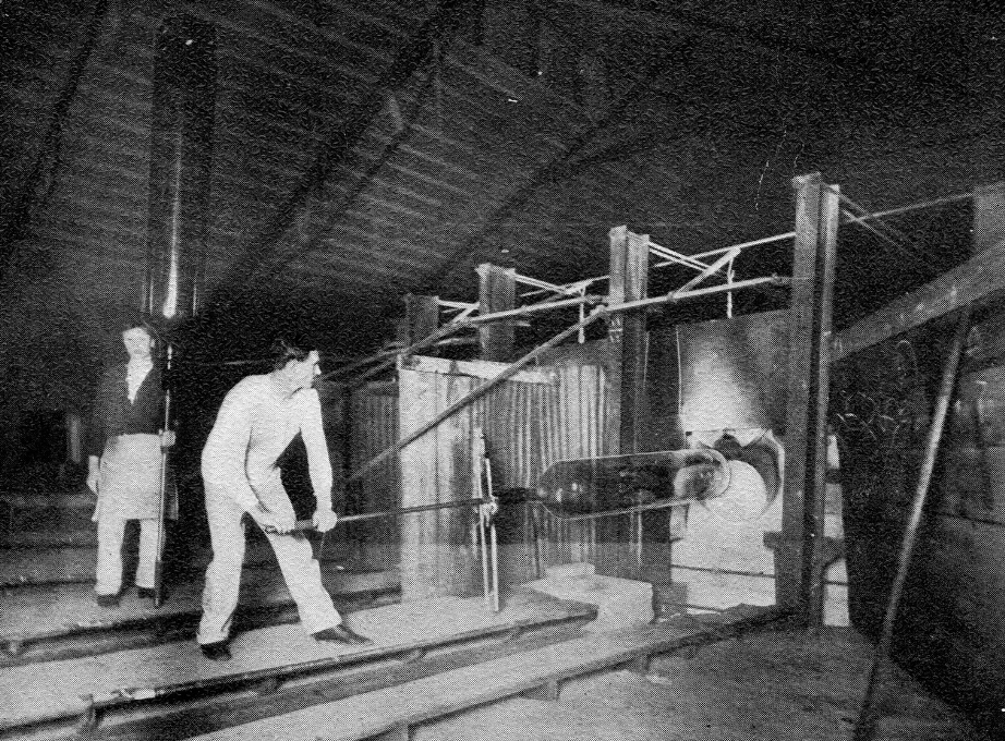Will Woods returned to Corning before the plant expansion was finished. His success at Wellsboro was rewarded with a new position as the superintendent of the Corning Glass Works sprawling main plant. His new job didn’t keep him from thinking about bulb blowing machines. The company had recently installed an automatic tube drawing machine to replace the hand process used in both Corning and Wellsboro. The machine fed a ribbon of glass onto a rotating mandrel with air blown through the center and tubing was drawn off the end in a continuous process. In 1921, Woods formed an idea of how to use that ribbon of glass in a completely different way. According to his co-inventor, David Gray, Woods tested the idea by gathering some glass, flattening it, and laying it onto a metal plate with a hole in it. After letting it sag through the hole, he put the tip of a blowpipe that fit into the hole onto the glass and blew into it. He imagined a continuous chain of plates with a ribbon of glass on it along with blow heads on top and molds underneath. This idea would become the ribbon machine.